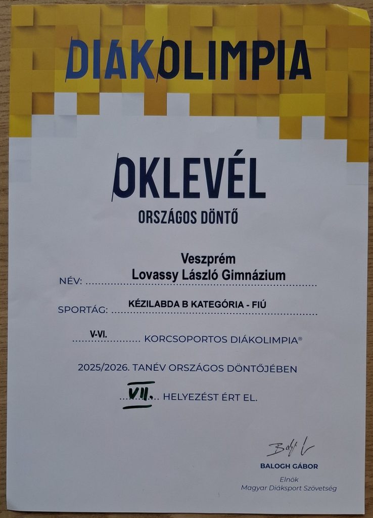 2026. március 27-29. között Békéscsabán került megrendezésre a Kézilabda „B” Diákolimpia Országos Döntője, ahol iskolánk fiú csapata hatalmas küzdelemben a 7. helyen végzett.